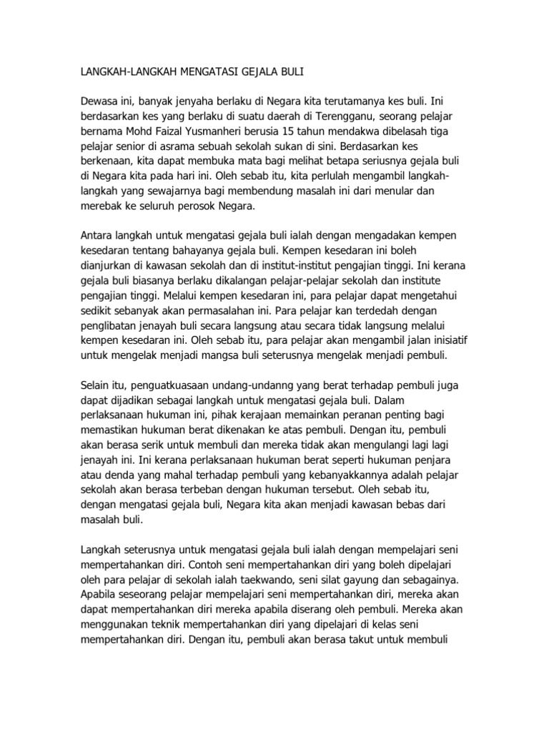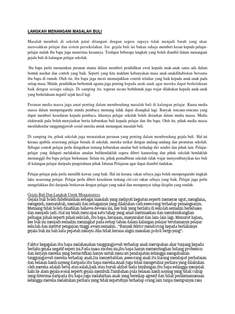 Pelajar - mengelakkan diri daripada bersendirian buka peluangkesempatan untuk. Dalam mengejar hal dunia ibu bapa terlalu sibuk sehingga tiada masa untuk mendidik dan meluangkan masa untuk anak-anak. Oleh itu langkah-langkah yang sesuai perlu dilakukan untuk mengatasi masalah buli di sekolah.